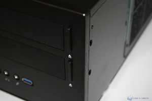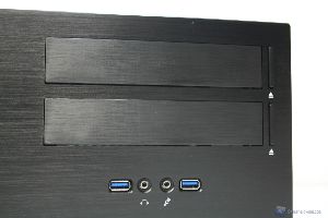La parte frontale è caratterizzata da una struttura a corpo unico in alluminio spazzolato. E’ molto elegante e le rifiniture sono di prim’ordine. Nella parte sinistra in alto è presente il logo mentre nella parte bassa sono presenti i pulsanti di accensione e di reset, assieme ad un LED blu molto luminoso che attesta il funzionamento del sistema. Nella parte destra invece sono presenti due connettori USB 3.0, l’ingresso delle cuffie e del microfono, mentre nella parte immediatamente superiore sono presenti i due slot per le periferiche da 5.25”. La qualità complessiva è elevata e non si ha l’impressione di avere un prodotto di fascia bassa, bensì l’esatto opposto.