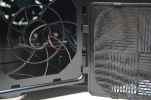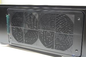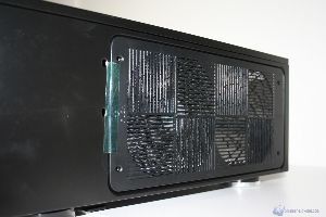 Una delle peculiarità dei prodotti SilverStone è sempre stata l’attenzione alle performance termiche, non a caso anche qui si è cercato di ottenere buone performance grazie all’accurato posizionamento dei sistemi di ventilazione. Sono state installate numerose ventole ed alloggiamenti per le stesse, precisamente due nella parte inferiore (verso il frontale), una sulla paratia destra, con la possibilità di alloggiarne una seconda, un alloggiamento per la ventola da 120mm dell’alimentatore nella parte sinistra ed infine due ventole da 80mm nella parte posteriore in estrazione. Indubbiamente è un quantitativo impressionante per un cabinet di questa tipologia, ed è inutile dire che anche nella parte inferiore è presente un filtro removibile. La paratia di alloggiamento dei dischi rigidi è davvero molto simile a quella adottata nell’ultimo cabinet analizzato dalla nostra redazione, il TJ04-Evolution. I dischi rigidi inoltre sono inseriti in uno strato di materiale antivibrazione, il che ne eliminerà eventuali problemi derivanti da regime di rotazione elevati del motore degli hard disk.